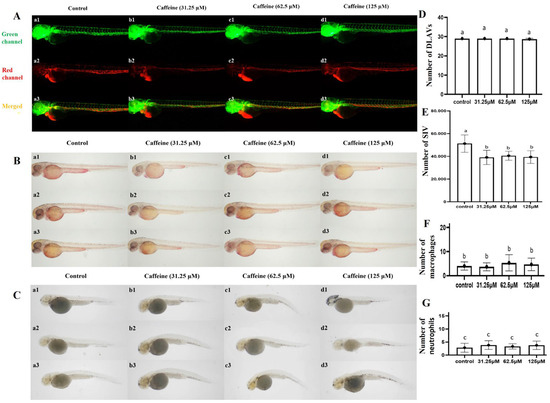 Developmental toxicity assessment of zebrafish embryos in response to caffeine exposure. (A) represents the development status of dorsal longitudinal anastomotic vessels (DLAVs) and subintestinal vein (SIV) after 72 h of caffeine exposure; (B,C) represent the NR labeling of macrophages and SB labeling of neutrophils in 72 h post-embryonic (hpe) caffeine-treated zebrafish larvae; (D) represents the DLAV numbers; (E) represents the SIV number; (F) represents the number of macrophages; (G) represents the number of neutrophils. The results are presented as mean ± SD (three trials, n = 10) and a bar chart marked with different letters indicates significant differences (p < 0.05). The letters a, b, and c on the bar chart represent the levels of significance. The same letter indicates no significant difference between the two, while different letters indicate a significant difference (p < 0.05).