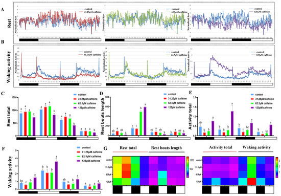 Sleep/wake behavior alterations and relevant parameters from 120 hpf to 168 hpf after caffeine was removed. (A) Rest total and (B) waking activity were averaged every 10 min and then normalized to the control values. The red lines (31.25 μM), green lines (62.5 μM), and purple lines (125 μM) show the averages of the different treated groups with caffeine, and the blue line shows the average of the control group. The black and white bars in the abscissa indicate the dark (10 h) and light (14 h) periods. (C–F) Histograms for rest total, rest bouts length, activity total, and waking activity. Values are means of quadruplicate groups and presented as mean ± standard deviation (SD, n = 24); main effect means that values in the same column with different superscripts are significantly different (p < 0.05). (G) Heatmap of sleep-wake related parameters. Rows indicate different behavioral parameters; columns indicate different groups. The black and white bars represente the dark and light periods respectively. The letters a, b, and c on the bar chart represent the levels of significance. The same letter indicates no significant difference between the two, while different letters indicate a significant difference (p < 0.05).