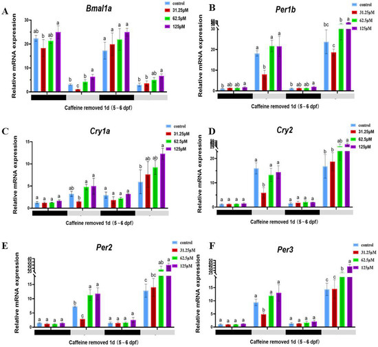 Relative mRNA expression of clock genes from 120 hpf to 168 hpf after caffeine was removed. The relative expression of each gene compared to the reference gene β-actin is shown as a bar graph. (A) is the Bmal1a gene, (B) is the Per1b gene, (C) is the Cry1a gene, (D) is the Cry2 gene, (E) is the Per2 gene, (F) is the Per3 gene. The black bars (dark1, dark2) and light gray bars (light1, light2) in the abscissa indicate the two dark/light periods—the dark (10 h) and light (14 h) periods. The results represent the mean ± SD (n = 3), and a bar chart marked with different letters indicates significant differences (p < 0.05). The letters a, b, and c on the bar chart represent the levels of significance. The same letter indicates no significant difference between the two, while different letters indicate a significant difference (p < 0.05).