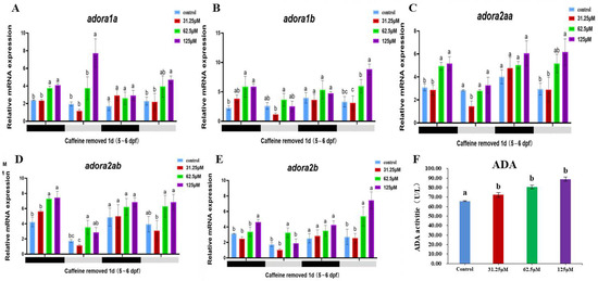 Relative mRNA expression of adenosine receptor genes from 120 hpf to 168 hpf after caffeine was removed and ADA enzyme activity in response to different concentrations of caffeine. (A) to (E) represent the diurnal expression patterns of five adenosinergic receptor genes under the influence of different concentrations of caffeine, where (A) is the adora1a gene, (B) is the adora1b gene, (C) is the adora2aa gene, (D) is the adora2ab gene, and (E) is the adora2b gene. (F) represents the enzyme activity of ADA under the influence of different concentrations of caffeine. Both the adenosinergic receptor genes and the ADA enzyme activity show an upward trend. The letters a, b, and c on the bar chart represent the levels of significance. The same letter indicates no significant difference between the two, while different letters indicate a significant difference (p < 0.05).