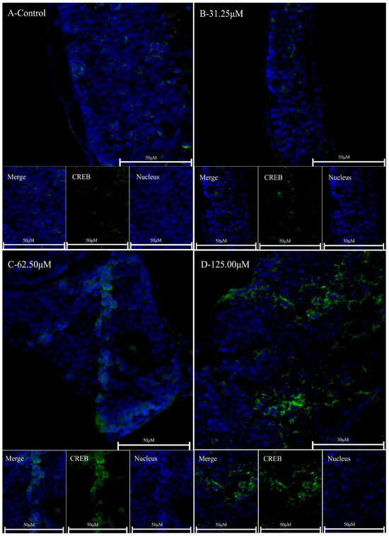 Immunofluorescence analysis of CREB in zebrafish brain tissue following exposure to varying concentrations of caffeine. (A) is designated as the control cohort, while (B–D) correspond to the experimental groups treated with caffeine at concentrations of 31.25 μM, 62.5 μM, and 125 μM, respectively. The term “Nucleus” refers to the cellular nuclear staining visualized in blue, “CREB” denotes the immunofluorescent labeling of the CREB protein in green, and “Merge” illustrates the composite image where the blue and green channels are superimposed.