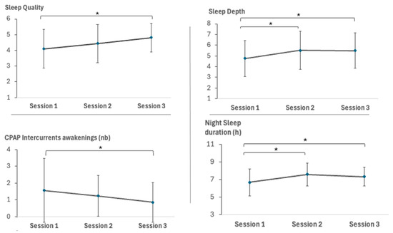 Subjective evaluations from the St-Mary’s Sleep Questionnaire. Evaluations of sleep quality, sleep depth, number of intercurrent awakenings resulting from the CPAP use, and night sleep duration in hours, assessed on the first day of each session. Note: Session 1 = start of the experiment, Session 2 = after three months of CPAP treatment, Session 3 = after six months of CPAP treatment. For Sleep Depth scores, 1 = very light, 2 = light, 3 = quite light, 4 = moderately light, 5 = moderately deep, 6 = quite deep, 7 = deep, 8 = very deep. For Sleepiness scores, 1 = very sleepy, 2 = quite sleepy, 3 = a little sleepy, 4 = lucid, 5 = alert, 6 = very alert. * p < 0.05. Error bars represent standard errors.