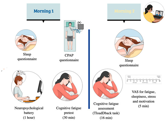 Symptomatic treatments of OSA such as continuous positive airway pressure (CPAP [16]) can potentially limit its negative consequences and optimize quality of life [5]. Although CPAP treatment leads to a restoration of sleep functions (and limits SF), its impact on cognitive impairment remains poorly investigated, supporting the consensus that it markedly improves SRBD-related daytime sleepiness [17]. Only vigilance was consistently shown to be improved after CPAP use [16]. However, other domains could and should benefit from improved sleep quality after CPAP use, e.g., declarative memory [7]. Notably, mental or cognitive fatigue (CF) is defined as a decrease in cognitive efficiency developing during sustained cognitive demands in conditions of constrained processing time, independently of sleepiness [18]. CF may arise from prolonged duration and/or limited processing time in mentally challenging tasks, potentially leading to subjective fatigue, feelings of “tiredness and lack of energy”, and a decline in performance [19]. Dynamic models of stress and performance [20,21] suggest that drops in performance under high cognitive load conditions are actually associated with disruptions in the access to the pool of brain resources, rather than a mere reduction in these resources. They also suggest that the manifestation of CF is partially dependent on previous sleep conditions and their restorative effects on cognitive functions [22,23].