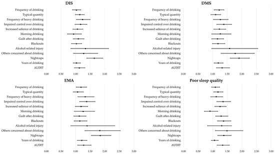 Association of alcohol use patterns with insomnia symptoms and poor sleep quality. DIS, difficulty initiating sleep; DMS, difficulty maintaining sleep; EMA, early morning awakening; CI, confidence interval; AUDIT, Alcohol Use Disorders Identification Test.