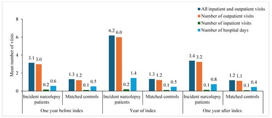 The mean number of all inpatient and outpatient visits was statistically significantly higher (p < 0.0001) among incident narcolepsy patients compared to matched controls in the year before the index (3.1 versus 1.3), year during the index (6.2 versus 1.3), and year after the index (3.4 versus 1.2) (Figure 1). The difference in outpatient visits was statistically significant for all years (p < 0.0001) and for inpatient visits during the year of the index (p = 0.007). During the year of the index, incident narcolepsy patients had, on average, 6.2 visits, of which 0.2 were hospitalizations, compared to 1.3 and 0.1 among matched controls (Supplementary Table S1).