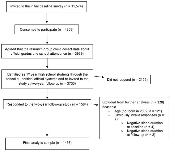 According to the invited schools, the two counties had 11,574 registered 1st-year high school students. Of these, 4863 responded to the initial wave of the study (response rate: 42.0%). From these, 3736 students agreed that the researchers could link their responses to official registry-based data from the school authorities and to verify that they were registered as high school students, which were required to be invited to the follow-up survey. Among these, 1584 students (42.4% of the re-invited cohort) responded to the two-year follow-up survey. Of these, data from 121 students not born in 2002 were excluded from further analyses to avoid any age-confounding effects. Of the remaining 1463 participants, 4 were excluded from further analyses due to obviously invalid answers (i.e., negative sleep duration at baseline), whereas three additional participants were excluded due to negative sleep duration at follow-up. Thus, the final sample comprised 1456 participants (40.0% of the students invited to the follow-up survey). For complete flow of participants, please see Figure 1.