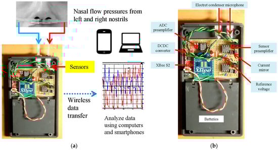 Measurement of nasal airflow during sleep is essential to evaluate sleep quality [1] and detect sleep apnea syndrome [2]. Specifically, nasal airflow monitoring is useful to detect sleep-related breathing disorders such as sleep apnea [3], which is characterized by repetitive interruptions in breathing. Such interruptions in breathing can lead to fragmented sleep, reduced oxygen levels, and increased risks of serious health problems such as cardiovascular disease [4], diabetes [5], and cognitive impairments [6]. Early and accurate detection of these conditions through respiratory measurements is important to support timely intervention and treatment. Tracking airflow through the nostrils can provide valuable insight into an individual’s breathing stability and overall sleep quality, which is crucial for early diagnosis and treatment planning for such disorders. However, expensive sensors are required to measure nasal airflow, and thus, an inexpensive sensor that can measure airflow and evaluate breathing conditions needs to be developed. We have developed a portable sleep sensor using an electret condenser microphone (ECM) as a micro-pressure sensor. The ECM can be utilized by constructing a circuit with bias and circuit constants suitable for the measurement. By using the ECM as a low-frequency pressure sensor for airflow detection [7,8], nasal airflow can be measured simply and inexpensively. Furthermore, the ECM is highly portable due to the achievement of data transmission using the ZigBee short-range wireless communication standard.