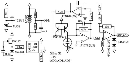In this example, an LT1078 (Linear Technology Corporation/Analog Devices, Wilmington, MA, USA) device was used in the microphone preamplifier stage, while a MAX492 (Maxim Integrated Products/Analog Devices, Wilmington, MA, USA) device, with rail-to-rail operation at the input and output, was used in the XBee ADC preamplifier stage. The input of the XBee Series 2 ADC ranges from 0 V to 1.2 V, meaning that the diode is driven with a constant current to generate a midpoint voltage of about 0.6 V, which is then converted at the preamplifier stage and input to the XBee ADC.