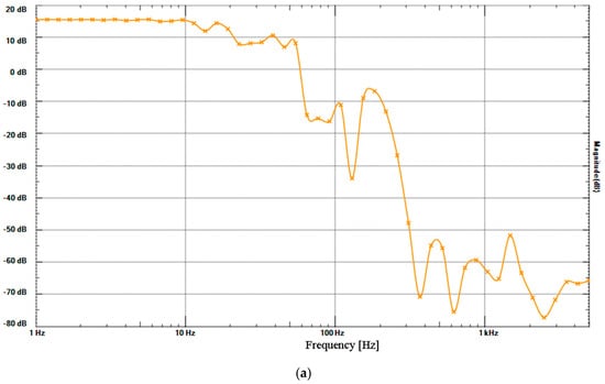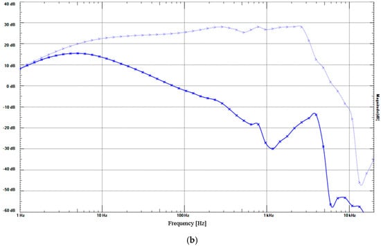 Frequency responses of pressure generators and sensors before the XBee analog-to-digital converter (ADC) measured with Analog Discovery (Digilent Inc., Austin, TX, USA). (a) Frequency responses of micro-pressure generator with a micro-speaker measured with GC30-101-C9N380 ±100 Pa. (b) Frequency responses of micro-pressure generator with a micro-speaker measured with an ECM using a circuit shown in Figure 2—solid line, with LPF (3.4 Hz; 4.7 kΩ, 10 μF); dotted line, without LPF; x-axis, frequency [Hz]; y-axis, magnitude [dB].