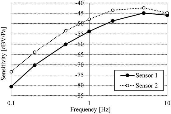 The digital micro-differential pressure gauge (GC30-101-C9N380 ±100 Pa; Nagano Keiki Co., Ltd., Tokyo, Japan; registered under the Japan Calibration Service System (JCSS) and compliant with the international Mutual Recognition Arrangement (MRA)), exhibited an almost flat frequency response from near direct current (DC) to 10 Hz when the sampling rate was 20 Hz, without an anti-aliasing filter (Figure 3). In the measurement of the ECM, the frequency response without an low-pass filter (LPF) (omitting the 10 μF capacitor of the transimpedance amplifier) was 6 dB/oct high-pass filter (HPF), with a cutoff frequency of around 10 Hz, which is a higher frequency than the 0.07 Hz frequency of the DC servo (Figure 3). When the LPF of 3.4 Hz was set in the transimpedance amplifier, the frequency response of the band-pass filter (BPF) was about 5 Hz. Based on the frequency response curve, the resonant frequency of the micro-speaker of the micro-pressure generator was around 2 kHz. There was no response up to DC because the ECM was not tightly sealed to the diaphragm. Although it is possible to perform simple measurements of ultra-low frequency noise, it might be difficult to measure infrasound.