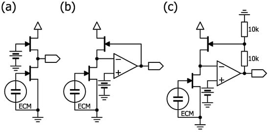 Circuit examples for ECM bias using a cascode-like circuit. These configurations represents a theoretical design concept and has not yet been experimentally validated. (a) Simple cascade-like circuit. (b) Cascode-like circuit with operational amplifier. (c) Cascode-like circuit using operational amplifier with gain (×2).