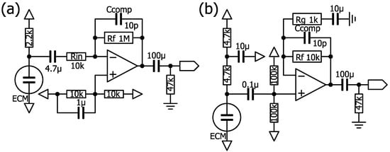 Op-amps with a large GBWP and large slew rate consume a lot of power and are unsuitable for this purpose, but several op-amps were tested for proper operation. NJM2732 (Nisshinbo Micro Devices Inc., Tokyo, Japan) and LMC6482 (National Semiconductor/Texas Instruments, Dallas, TX, USA) worked normally, but the output was stuck to the power supply voltage or ground with NJU7096 (Nisshinbo Micro Devices Inc., Tokyo, Japan). The maximum source/sink current is about 10/2 and 30/20 mA for NJM2732 and LMC6482, respectively, which is greater than the maximum current of the ECM. However, the maximum source/sink current for NJU7096 is only about 200/1000 μA, which is insufficient to supply power to the ECM.