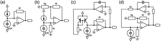 Circuit examples for ECM bias. (a) Constant current bias with I/V conversion by an op-amp. (b) Constant current bias with a non-inverting amplifier circuit. (c) I/V conversion with servo by an op-amp, as described in the LT1677 datasheet. (d) Non-inverting amplifier circuit with servo.