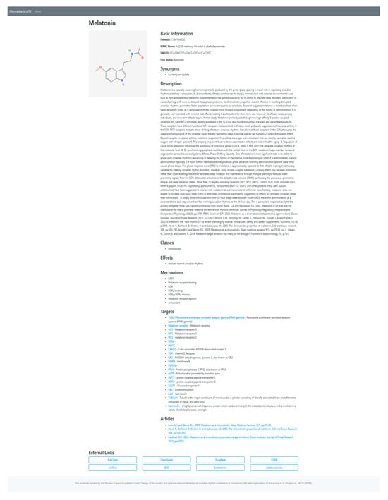 The Chronobiotics Database consolidates findings from numerous studies on the influence of chronobiotics on biological rhythms. The database currently comprises a comprehensive collection of more than 900+ unique scientific references, including peer-reviewed journal articles, preclinical trials, and experimental reports and datasets [12]. These sources were curated through systematic searches in established scientific repositories such as PubMed and PubChem, Medline, Mendeley data, ACS Publications, SpringerLink, Google Scholar, Scopus (https://scholar.google.com/, access date 16 June 2025), and Web of Science using keywords related to circadian rhythms, aging, longevity, and chronobiotics. The origin of the present research is gerontological; primarily, the chronobiotics descriptions were archived and categorized by our team for aging desynchronosis treatment in model animals for translational purposes, but while accumulating data we found it interesting to widen the project on all fields of biological rhythm research, but still several modulators of circadian rhythms were described majorly in the framework of geriatric and biogerontology research like resveratrol, mTOR inhibitors, and K185. The desynchronosis is one of the key signs of aging and ChronobioticsDB was created to discover new chronobiotics for its treatments as well as geroprotectors with chronobiotic effects.
