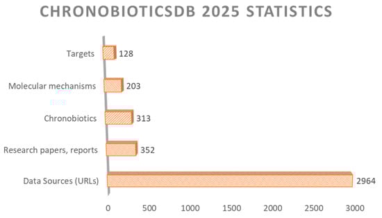 The structure of ChronobioticsDB mirrors this distribution: each compound record is linked to one or more pharmacological classes through the dedicated Bioclassification table, enabling class-level queries and analytics. The total number of links and citations is growing constantly; thus, we tried to give basic statistics on links and objects according to the last updates (Figure 3).
