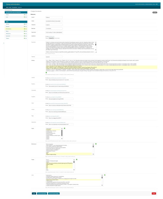 ChronobioticDB (accessible at https://chronobiotic.ru, access date 16 June 2025) is an online database designed to provide a centralized resource on chronobiotic compounds (drugs or molecules that modulate circadian rhythms), addressing the lack of a unified knowledge base in this domain.The web interface is organized into two complementary components that together support both broad data dissemination and expert curation (Figure 1). The publicly accessible front-end displays a catalog of known and candidate chronobiotics in a searchable, filterable table, enabling users to quickly find entries by compound name, molecular formula, or chemical structure (SMILES notation). Each entry is summarized with key fields such as the compound’s name, molecular formula, and FDA approval status, and users can click an entry to view additional details (e.g., a descriptive synopsis and reference links) in an intuitive pop-up panel. This user-friendly interface allows researchers and general users to easily explore the database and retrieve information, thereby promoting accessibility and dissemination of chronobiotic-related data (Figure 2).
