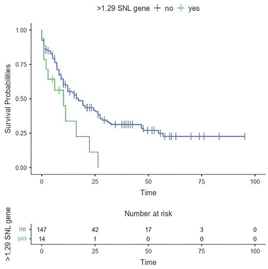 The eight studies demonstrate CIPC activity in CRs. Given the well-established deregulation of CGs in cancer, we decided to analyze CIPC expression levels in human tumors using the Xena Browser [], which imports data from The Cancer Genome Atlas (TCGA) and the Genotype-Tissue Expression (GTEx) project, thus providing a reliable database for comparing expression levels between tumors and healthy tissues. An image was generated containing expression comparisons across 34 tumor types available in the tool (Figure 1), along with a boxplot specifically depicting CIPC expression in AML (Figure 1). Furthermore, all analyses were performed using the Ensembl CIPC ID (ENSG00000198894) [] for standardization. Additionally, the Xena Browser was used to evaluate the survival of patients with CIPC–expressing AML, generating a Kaplan–Meier survival curve comparing overexpression and low expression groups (Figure 2).