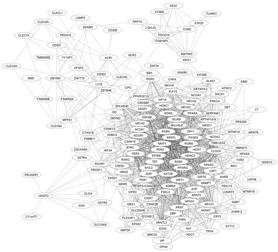 In this context, it is worth noting that the CLOCK–BMAL1 complex is negatively regulated across all types of leukemia []. Our analyses showed that CIPC may be overexpressed in AML, suggesting that this negative regulation could be influenced by CIPC. Furthermore, not only was CLOCK observed to have altered regulation in leukemias, but its analogue, the NPAS2 gene, was also found to be overexpressed in AML [].