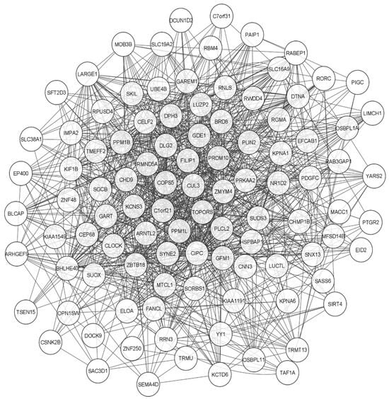In this study, different bioinformatics tools were also used to evaluate the potential functions of CIPC in other pathways that may influence human carcinogenesis, specifically leukemogenesis. The STRING database [] was used to generate a network of protein–protein interactions, and the results were imported into CYTOSCAPE version 3.10.2 [] for further analysis (Figure 3). Additionally, another interaction network genetic interaction was generated using the GENEMANIA database []. Using the plugin available in CYTOSCAPE version 3.10.2, these networks were constructed and employed to jointly evaluate pathway interactions, physical interactions, coexpression, genetic interactions, and target predictions (Figure 4) [].