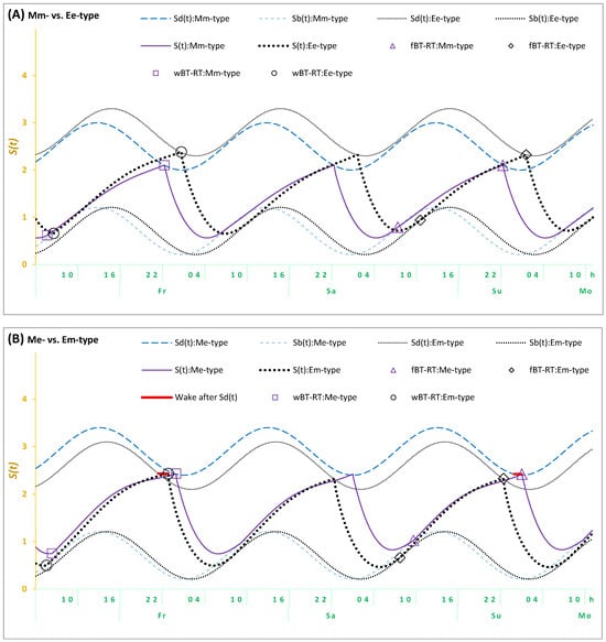 The results of the Me- and Em-types suggested the necessity of incorporating an additional assumption in the model-based simulations of their sleep–wake cycles to account for a delay in the transition between wakefulness and sleep in these types. It seems that their bedtime cannot be exclusively determined by the biological (body) regulators of their sleep–wake cycle (as shown in Figure 2A for Mm- and Ee-types). As shown in Figure 2B, it is necessary to account for the possibility of prolongation of wakefulness beyond the bedtime set by their biological sleep–wake regulating mechanisms. Such self-deprivation of sleep in early night hours appears to reflect an additional influence of “mental (mind) clocks” on bedtimes.