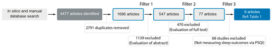 The initial search yielded 4477 articles (see Figure 1 for workflow). Of these articles, 2791 were duplicates and were removed, leaving 1686 titles and abstracts, which were screened for relevance. A total of 1139 articles were removed by screening the title and abstract (Filter 1), leaving 547 full-text articles to be assessed for eligibility by evaluating the full text (Filter 2). A total of 470 full-text articles were excluded in Filter 2, leaving 77 studies that were relevant. Of these, 68 were excluded in the Filter 3 process by selecting for studies that had PSQI measurement on both concussed and non-concussed individuals, leaving 9 studies (Table 1). The date of publication ranged from 2008 to 2023. Of these, two were abstracts [43,44]. Three studies used a case–control approach [9,44,45], of which one was an abstract [44]. Four studies were retrospective cohort trials or longitudinal [46,47,48,49], with the data overall including 796 participants, of which 340 were concussed.