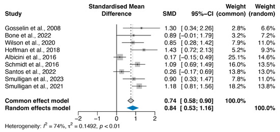 Given the presence of heterogeneity in our primary analysis, we investigated which study might have contributed to this through a funnel plot. Albicini and colleagues [49] reported an effect size that was most distinct from others (Figure 3a). The presence of potential heterogeneity indicates that the overall standardised mean difference is better estimated through a random effect model compared to a common effect model (Figure 2).