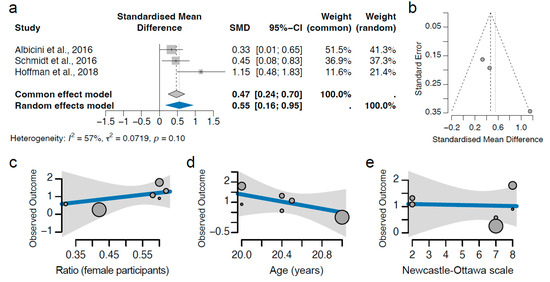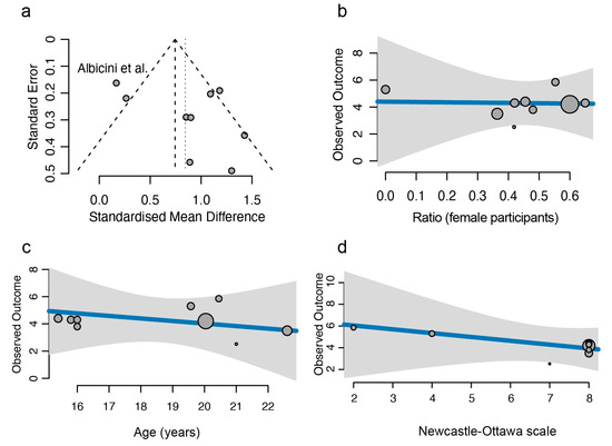 Publication bias and confounder analysis. (a) Funnel plot indicating the possible heterogeneity in the analysis. The standard error in the y-axis is a measure of study precision, and the standardised mean difference in the x-axis indicates the study results. Each dot represents an individual study, and the outlier is labelled. The outer dashed lines indicate the triangular region within which 95% of studies are expected to lie in the absence of both biases and heterogeneity. The middle dashed line indicates the overall standardised effect size determined via a common effect model, and the vertical dotted line represents the overall standardised effect size determined via a random effect model. (b–d) Confounder analysis of gender ratio (b), age (c), and Newcastle–Ottawa scores (d). The gender ratio, average age, and Newcastle–Ottawa scores of each study are plotted against the observed outcome and modelled in a meta-regression analysis. The size of each dot represents the weight of each study. All p-values of these confounders are above 0.05 [49].
