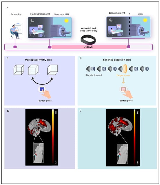 Participants’ sleep was recorded in the lab twice. During the first session, participants completed a night of sleep under polysomnography to screen for sleep abnormalities (apnea hourly index and periodic leg movement > 15; parasomnia or REM behavioral disorder). All participants further underwent a whole-brain structural MRI (sMRI) and a specific acquisition centered on the LC. Participants were then requested to sleep regularly for 7 days before the baseline night during the second session (±30 min from their sleep schedule) based on their preferred schedule (compliance was verified using sleep diaries and wrist actigraphy—Actiwatch and AX3, AXIVITY LTD, Newcastle, UK). The evening before the baseline night, participants first completed questionnaires including Beck depression inventory (BDI) [39], Beck anxiety inventory (BAI) [40], the Pittsburgh sleep quality index (PSQI) [41], Epworth sleepiness scale (ESS) [42] and Horne–Ostberg’s Morningness–Eveningness scale [43] for assessing depression, anxiety, sleep quality, sleepiness and chronotype, respectively. They remained awake for 3 h under dim light (<10 lux) for electrode placement and preparation to sleep prior to the recording of their habitual sleep in darkness under EEG. Approximately 3 h after wake-up time under dim light (<10 lux), participants completed a functional MRI (fMRI) session that included 3 tasks (Figure 1A). This paper is centered on the analyses of the perceptual rivalry task and auditory salience detection task.