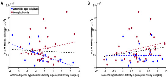 Association between REM theta energy and the anterior–superior and posterior hypothalamus activity during the perceptual rivalry task. The GLMM yielded a statistical trend for the hypothalamus activity by hypothalamus subpart interaction (p = 0.08), and post hoc analyses led to a statistical trend for a negative association with the anterior–superior hypothalamus activity (p = 0.07) (A) and a nominal significance for a positive association with the posterior hypothalamus activity (p = 0.05) (B) Simple regression lines are used for a visual display and do not substitute the GLMM outputs (Table 2). The black line represents the regression irrespective of age groups (young + late middle-aged adults). The red line represents the regression in young individuals, and the blue line represents the regression in late–middle aged individuals. Non-meaningful associations (i.e., no statistical significance or trend) between REM theta energy or sigma power prior to REMS and the activity of all the subparts of hypothalamus during the perceptual rivalry task and salience detection task are displayed on Figures S1–S4.