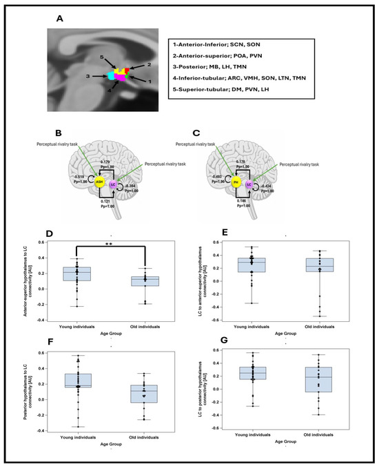 (A) Segmentation of the hypothalamus in five subparts in a representative participant. The nuclei encompassed by the different subparts are indicated in the right inset—according to [19]. ARC: Arcuate nucleus; DM: dorsomedial nucleus; LH: lateral hypothalamus; LTN: lateral tubular nucleus; MB: mamillary body; POA: preoptic area; PVN: paraventricular nucleus; SCN: suprachiasmatic nucleus; SON: supraoptic nucleus; TMN: tuberomammillary nucleus; VMN: ventromedial nucleus. (B) The DCM model, which included intrinsic connections between anterior–superior hypothalamus (ASH) and locus coeruleus (LC), along with self-feedback gain control connections for both regions. Task inputs were further considered to reach both regions. The DCM analysis showed that there was very strong evidence (Pp = 1.0) for reciprocal positive influence between LC and ASH as well as self-inhibition in both LC and ASH. (C) The DCM model, which included intrinsic connections between posterior hypothalamus (PH) and locus coeruleus (LC), along with self-feedback gain control connections for both regions. Task inputs were further considered to reach both regions. The DCM analysis showed that there was very strong evidence (Pp = 1.0) for reciprocal positive influence between LC and PH as well as self-inhibition in both LC and PH. (D) Anterior–superior hypothalamus to LC connectivity in young and late middle-aged groups. Younger individuals had significantly higher connectivity than late middle-aged individuals (t = −2.27; p = 0.027). (E) LC to anterior–superior hypothalamus connectivity in young and late middle-aged groups. Connectivity strengths were not significantly different between two age groups (t = −1.32; p = 0.193). (F) Posterior hypothalamus to LC connectivity in young and late middle-aged groups. Connectivity strengths were not significantly different between two age groups (t = −1.49; p = 0.142). (G) LC to posterior hypothalamus connectivity in young and late middle-aged groups. Connectivity strengths were not significantly different between two age groups (t = −0.72; p = 0473). **: p < 0.05.