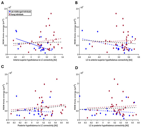 Association between REM theta energy and the connectivity metrics between the LC and the hypothalamus nuclei. (A) Connectivity from the anterior–superior hypothalamus to the LC. The GLMM yielded a significant age group by connectivity interaction (p = 0.026), and post hoc analyses led to a significant association for the late middle-aged (p = 0.042) but not the young group (p = 0.294). After excluding one putative outlier in TIV (≥4 SD), the connectivity-by-age-group interaction became more robust (t = 2.37; p = 0.022). (B) Connectivity from the LC to the anterior–superior hypothalamus. The GLMM did not yield a significant age group by connectivity interaction. (C) Connectivity from posterior hypothalamus to the LC. The GLMM did not show a significant age group by connectivity interaction. (D) Connectivity from the LC to the posterior hypothalamus. The GLMM did not show a significant age group by connectivity interaction. Simple regression lines are used for a visual display and do not substitute the GLMM outputs (Table 3). The black line represents the regression irrespective of age groups. Solid and dashed regression lines represent significant and non-significant outputs of the GLMM, respectively.