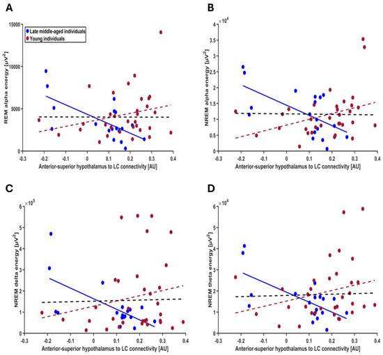 Exploratory association between other frequency bands of the EEG during both REM and NREM sleep and the connectivity from the anterior–superior hypothalamus to the LC (A) REM alpha energy; the GLMM yielded a significant age group by connectivity interaction (p = 0.002), and post hoc analyses led to a significant association for the late middle-aged (p = 0.007) but not the younger group (p = 0.108). (B) NREM alpha energy; the GLMM yielded a significant age group by connectivity interaction (p = 0.002), and post hoc analyses led to a significant association for the late middle-aged (p = 0.0008) but not the younger group (p = 0.099). (C) NREM delta energy; the GLMM yielded a significant age group by connectivity interaction (p = 0.015), and post hoc analyses led to a significant association for the late middle-aged (p = 0.047) but not the younger group (p = 0.142). (D) NREM theta energy; the GLMM yielded a significant age group by connectivity interaction (p = 0.005), and post hoc analyses led to a significant association for the late middle-aged (p = 0.023) but not the younger group (p = 0.085). Simple regression lines are used for a visual display and do not substitute the GLMM outputs (Table 4). The black line represents the regression irrespective of age groups. Solid and dashed regression lines represent significant and non-significant outputs of the GLMM, respectively. Non-significant associations between the energy of other frequency bands and the connectivity from anterior–superior hypothalamus to the LC are displayed on Figure S5.