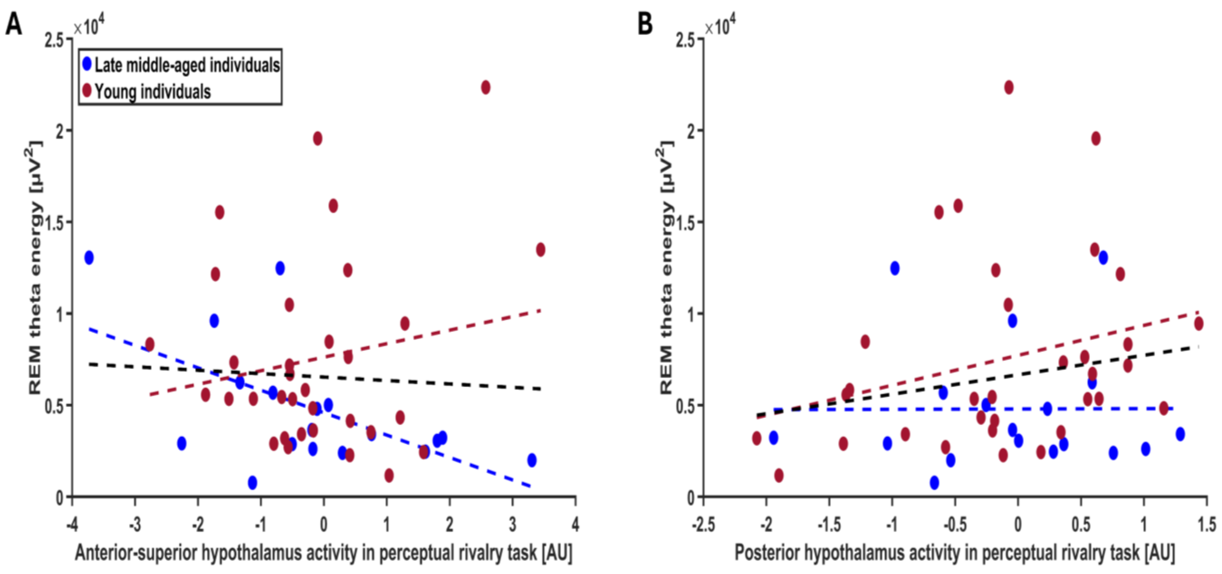 Among the four connectivity parameters of the two DCM models, we find that only the connectivity from the anterior–superior subparts of the hypothalamus to the LC decreases in the late middle-aged compared with the younger individuals. We further find that the stronger the excitatory connectivity from the anterior–superior hypothalamus to the LC during wakefulness (indicated by positive connectivity values), the lower REM theta energy in late middle-aged individuals, and the stronger the inhibitory connectivity from the anterior–superior hypothalamus to the LC during wakefulness (indicated by negative connectivity values), the higher REM theta energy in late middle-aged individuals. Theta oscillations consist of the most typical oscillatory mode of REM sleep. They are considered to be cortical correlates of the hippocampus ripple waves occurring during sleep and related to the memory function of REM sleep [