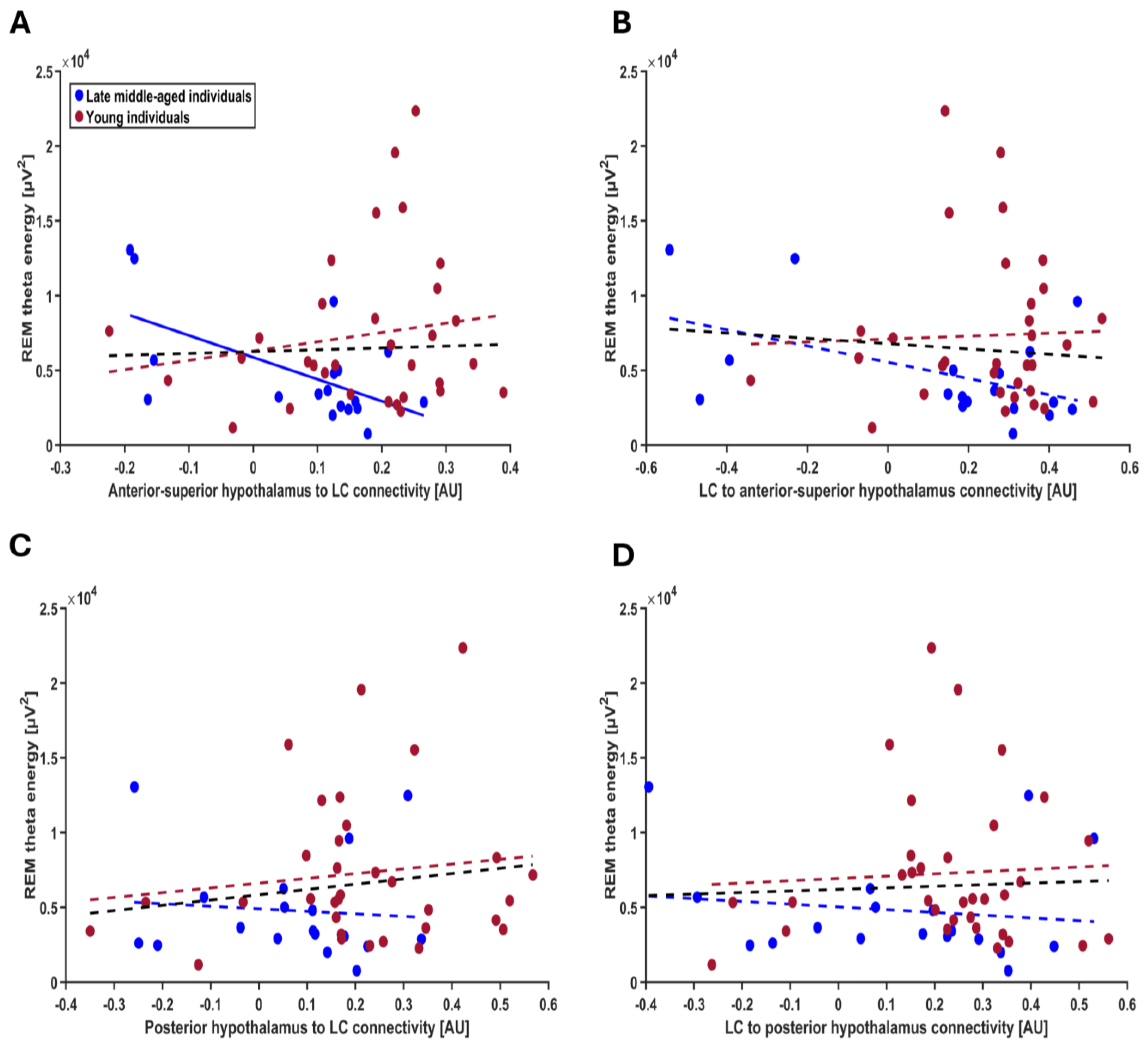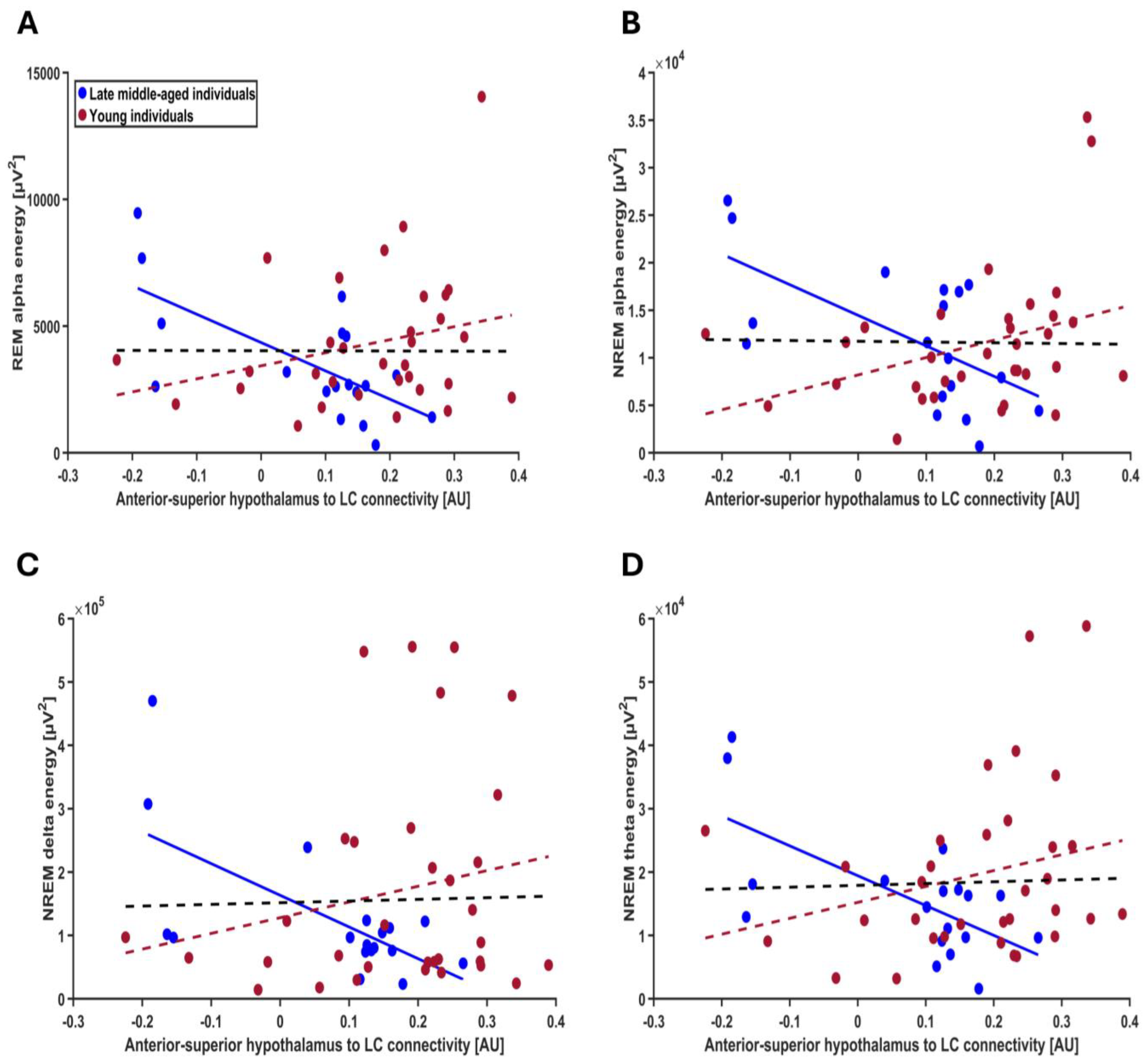 Interestingly, we found that the associations between anterior–superior hypothalamus to LC connectivity and neural oscillations extend beyond the theta energy in REMS. In late middle-aged individuals, its negative correlations with alpha energy in REMS and NREMS as well as delta and theta energy in NREMS suggest a potential broader role for this connectivity in influencing sleep electrophysiology. Delta energy in NREMS is recognized as a marker of sleep need as well as sleep maintenance, quality, and restorative processes [