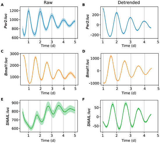 Bioluminescence time-series for Per2:luc (A,B), Bmal1:luc (C,D), and SNAIL:luc (E,F). Excluding a 12 h transient, shown are raw time-series (A,C,E) and time-series after de-trending (B,D,F) by removing the average of a 24 h moving window. The mean (raw or de-trended) time-series is plotted as a solid line, with the standard error of the mean as a semi-transparent envelope around it. (N = 3 for Per2:luc, N = 3 for Bmal1:luc, and N = 15 for SNAIL:luc).