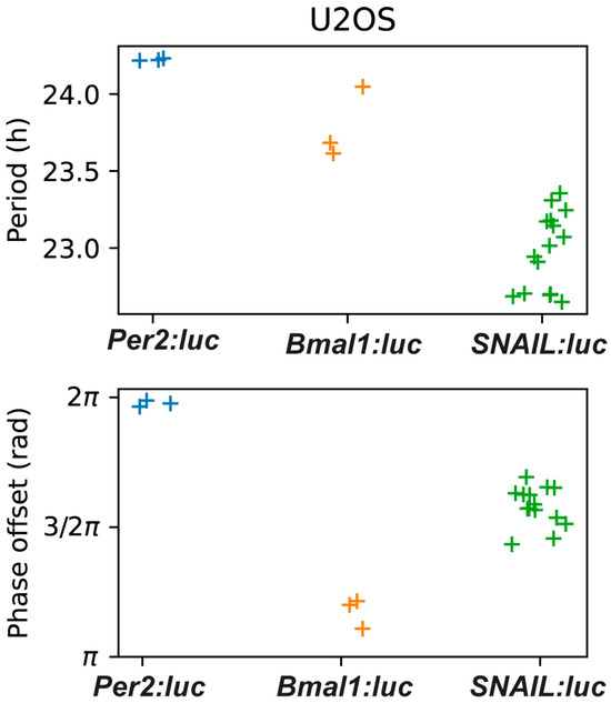 We used luminometry assays to track the oscillations of SNAIL-associated luciferase from our reporter. Preliminary experiments in U2OS-SNAIL:luc cells revealed that signals were both trackable and oscillatory. In subsequent experiments we performed parallel assessments, comparing SNAIL with BMAL1 and PER2, using reporter cell lines previously generated by our lab (U2OS-Bmal1:luc and U2OS-Per2:luc, respectively) [62]. All three cell lines were synchronized via dexamethasone pulse for two hours, a common method used to synchronize U2OS cells [63,64,65,66,67]. Bioluminescence intensity was tracked for seven days. The signals were pre-processed by removing the first 24 h of raw data to remove the transient peak. Oscillations beyond five days were discarded, as they were generally determined to be too weak to analyze. Then, the data was de-trended by subtracting a 24 h window moving average (Figure 1 and Figure S3). From the de-trended data, circadian parameters were calculated, including the periods and phase offsets (Figure 2 and Figure S4). The period is the length of time between sequential peaks or troughs. The phase offset measures the time of the first peak relative to the dexamethasone pulse, which is the reference time (time = 0 h), so a phase of indicates that the peak is one half of a cycle after the pulse (as is the case for BMAL1). A time-series was considered an outlier if the period or phase offset was greater than two standard deviations away from the mean for all recordings for a given reporter. Three U2OS-SNAIL:luc replicates (of 18) were deemed outliers.