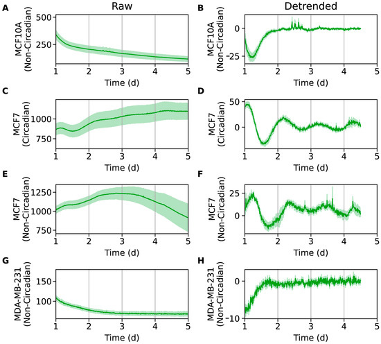 Bioluminescence time-series for SNAIL:luc in MCF10A (A,B), MCF7 (C–F), and MDA-MB-231 (G,H) cell lines. Excluding a 12 h transient, shown are raw time-series (A,C,E,G) and time-series after de-trending (B,D,F,H) by removing the average of a 24 h moving window. The mean (raw or de-trended) time-series is plotted as a solid line, with the standard error of the mean as a semi-transparent envelope around it. Seven MCF7 time-series were deemed circadian (C,D; rhythmic with a period in the range of 16 to 32 h). The remaining ten MCF7 (E,F) and all MCF10A (A,B) and MDA-MB-231 (G,H) time-series were non-circadian. (N = 15 for MCF10A-SNAIL:luc, N = 7 for MCF7-SNAIL:luc (circadian), N = 10 for MCF7-SNAIL:luc (non-circadian), N = 6 for MDA-MB-231-SNAIL:luc).