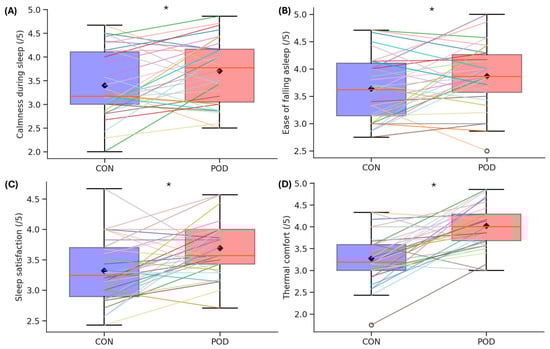 | Calmness of sleep (/5) | 3.4 ± 0.7 | 3.7 ± 0.7 * |