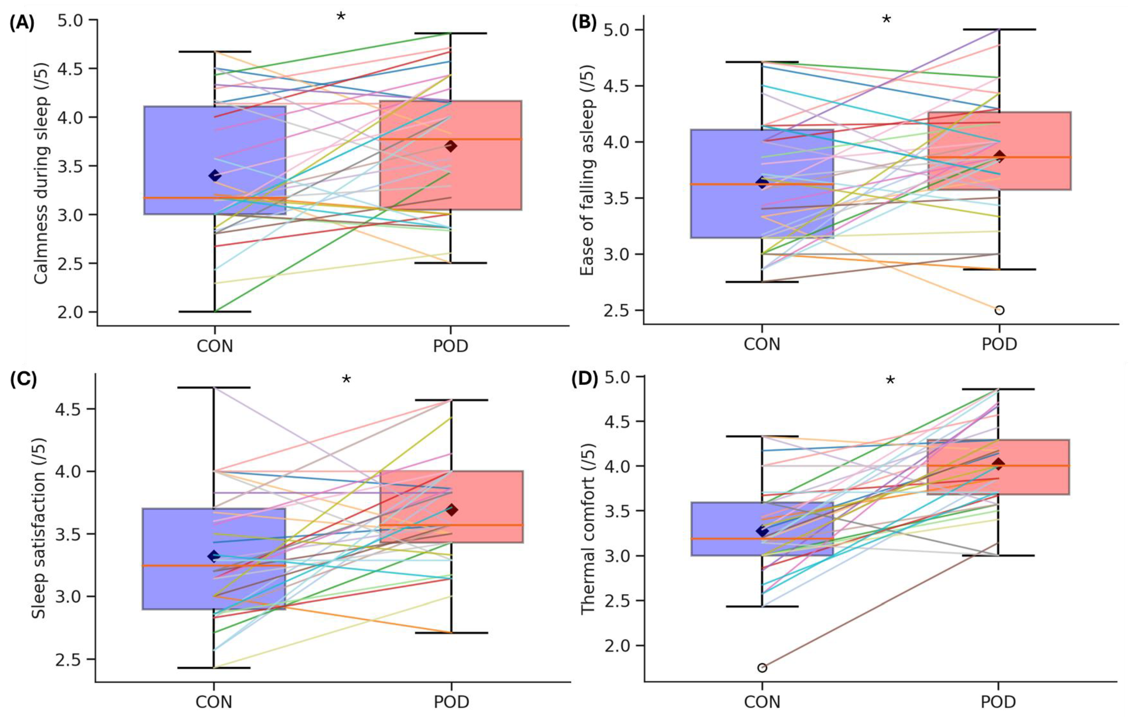 | Ease of falling asleep (/5) | 3.6 ± 0.6 | 3.9 ± 0.6 * |