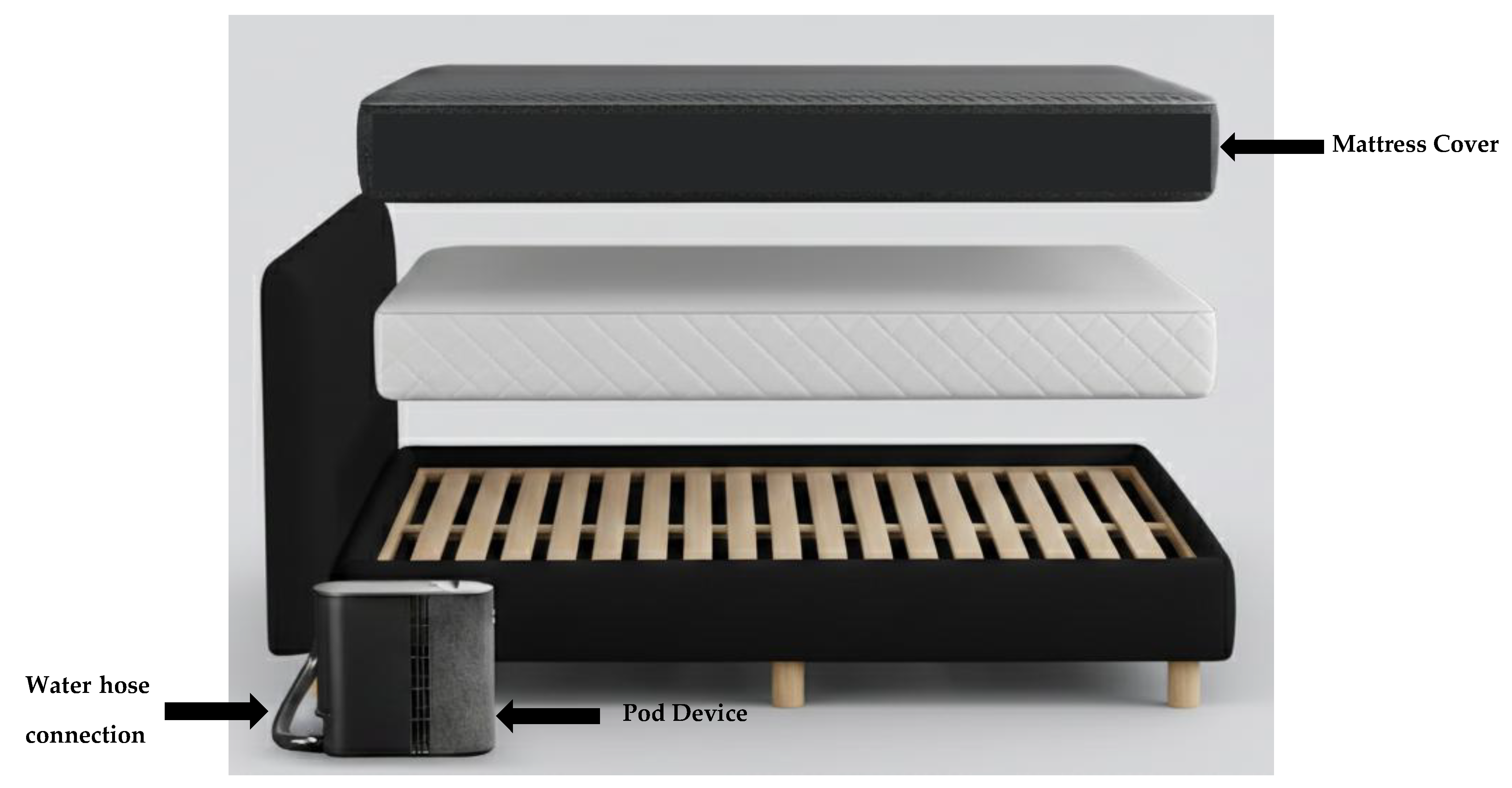 - Moyen, N.E.; Ediger, T.R.; Taylor, K.M.; Hancock, E.G.; Holden, L.D.; Tracy, E.E.; Kay, P.H.; Irick, C.R.; Kotzen, K.J.; He, D.D. Sleeping for One Week on a Temperature-Controlled Mattress Cover Improves Sleep and Cardiovascular Recovery. Bioengineering 2024, 11, 352. [Google Scholar] [CrossRef]