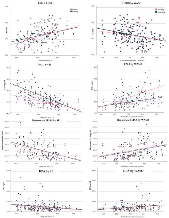 The findings of multiple regression underscore the significance of sleep efficiency in influencing vascular and procoagulant biomarkers among nurses. Higher SEF was associated with improved endothelial function. This aligns with recent research suggesting that better sleep continuity enhances cardiovascular recovery and reduces pro-thrombotic states []. Conversely, increased sleep fragmentation (WASO) was consistently linked to adverse outcomes, including decreased RHI and elevated PAI-1, Heparanase, and HPA levels, which are all markers of impaired vascular health and heightened thrombotic risk. These results are supported by prior evidence indicating that fragmented sleep is associated with systemic inflammation [] and endothelial dysfunction [,]. The differential effects observed between morning and evening measurements suggest potential diurnal variability in biomarker responses to sleep parameters, emphasizing the importance of temporal context in interpreting physiological data.