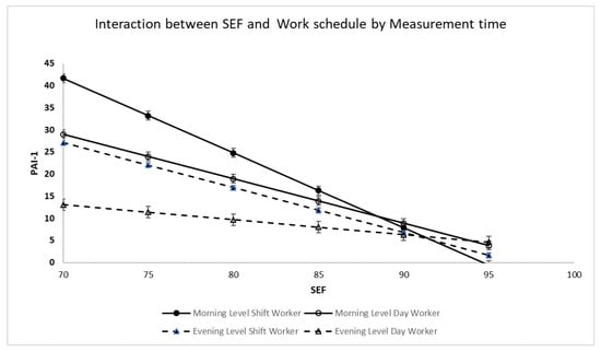 PAI-1: Interaction between SEF and Work schedule by Measurement time. The figure was derived from the multiple regression model. The bars represent the standard error from the model.