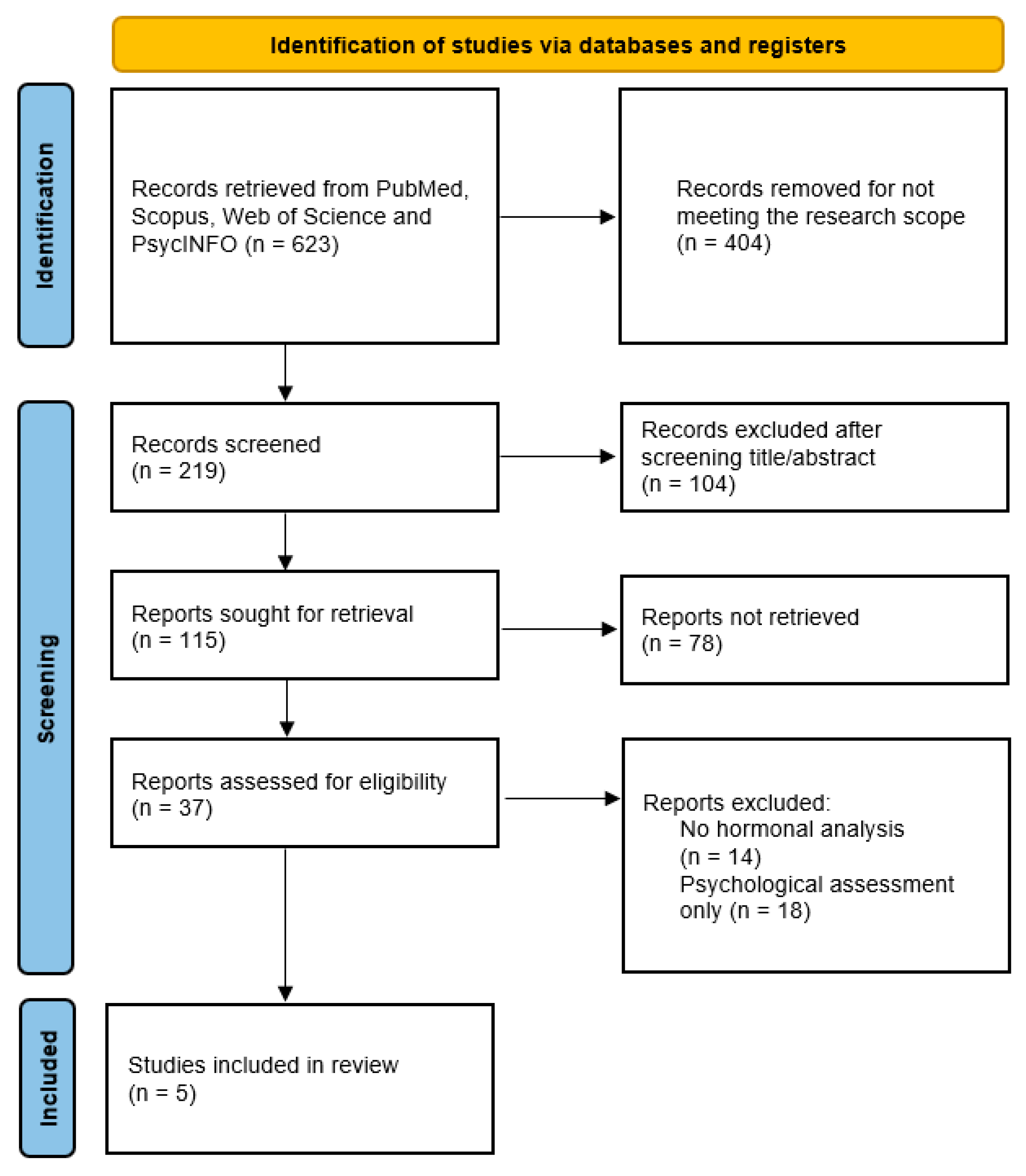 | Population | Individuals diagnosed with burnout, healthcare professionals | Studies without hormonal biomarker analysis |