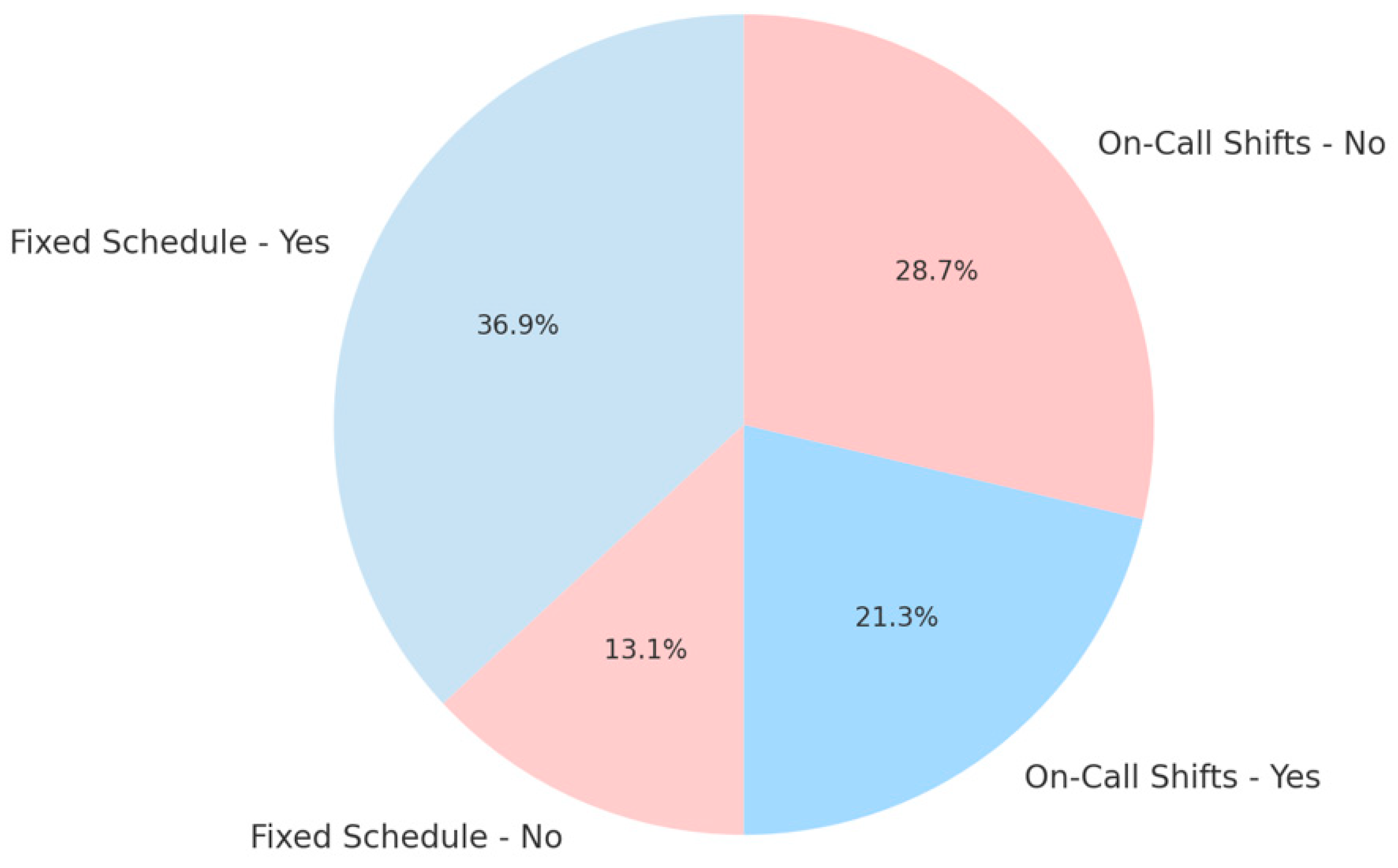| Fixed Schedule (Regular schedule) | −0.15 (negative correlation) | Regular schedules show a protective effect, suggesting that circadian stability may mitigate burnout. |