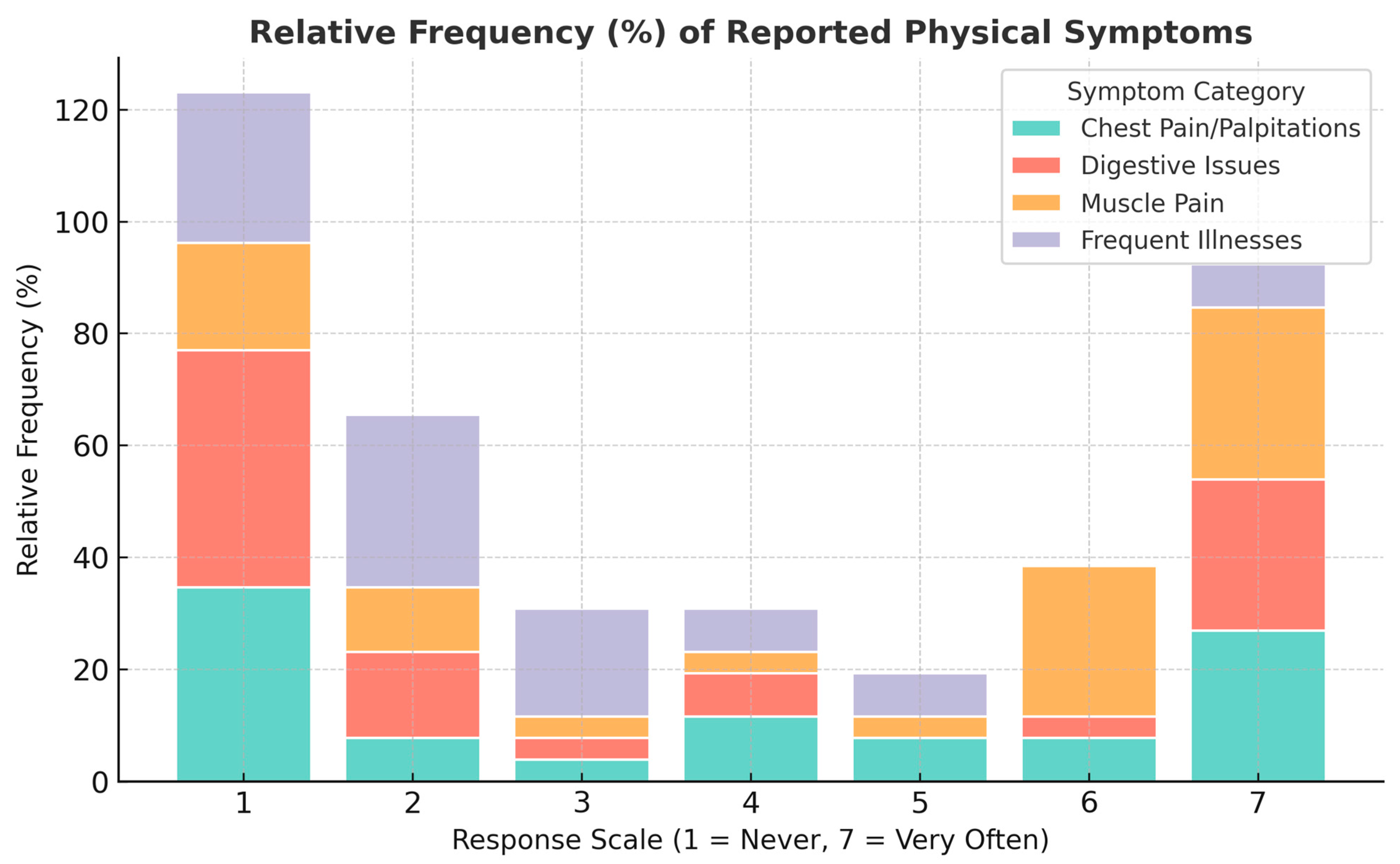 | Physical Symptoms | 0.81 (strong positive) | Increased physical symptoms are strongly associated with burnout severity, indicating significant physiological impacts (cardiac, digestive, headaches, musculoskeletal, immune). |