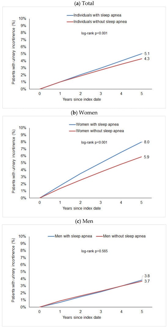 After up to five years of follow-up, 5.1% of individuals with sleep apnea and 4.3% of individuals without sleep disorders were diagnosed with urinary incontinence (Figure 1a). These proportions were 8.0% vs. 5.9% in females (Figure 1b) and 3.8% vs. 3.7% in males (Figure 1c).