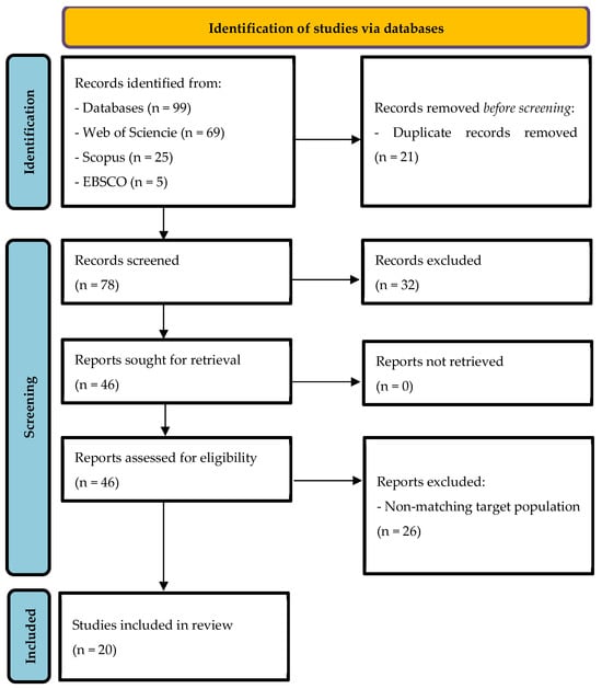 A total of 99 records were identified from three databases: EBSCO, Scopus, and Web of Science. After removing 21 duplicate records, 78 records remained for screening. During the initial screening of titles and abstracts, 32 records were excluded due to lack of full text (19), being literature reviews (7), or addressing specific problematics that fell outside the scope of this review (6). This left 46 articles for full-text assessment. Of these, 26 were excluded because they involved a non-matching target population, leaving 20 studies that met all inclusion criteria. These selected studies were included in the final synthesis.