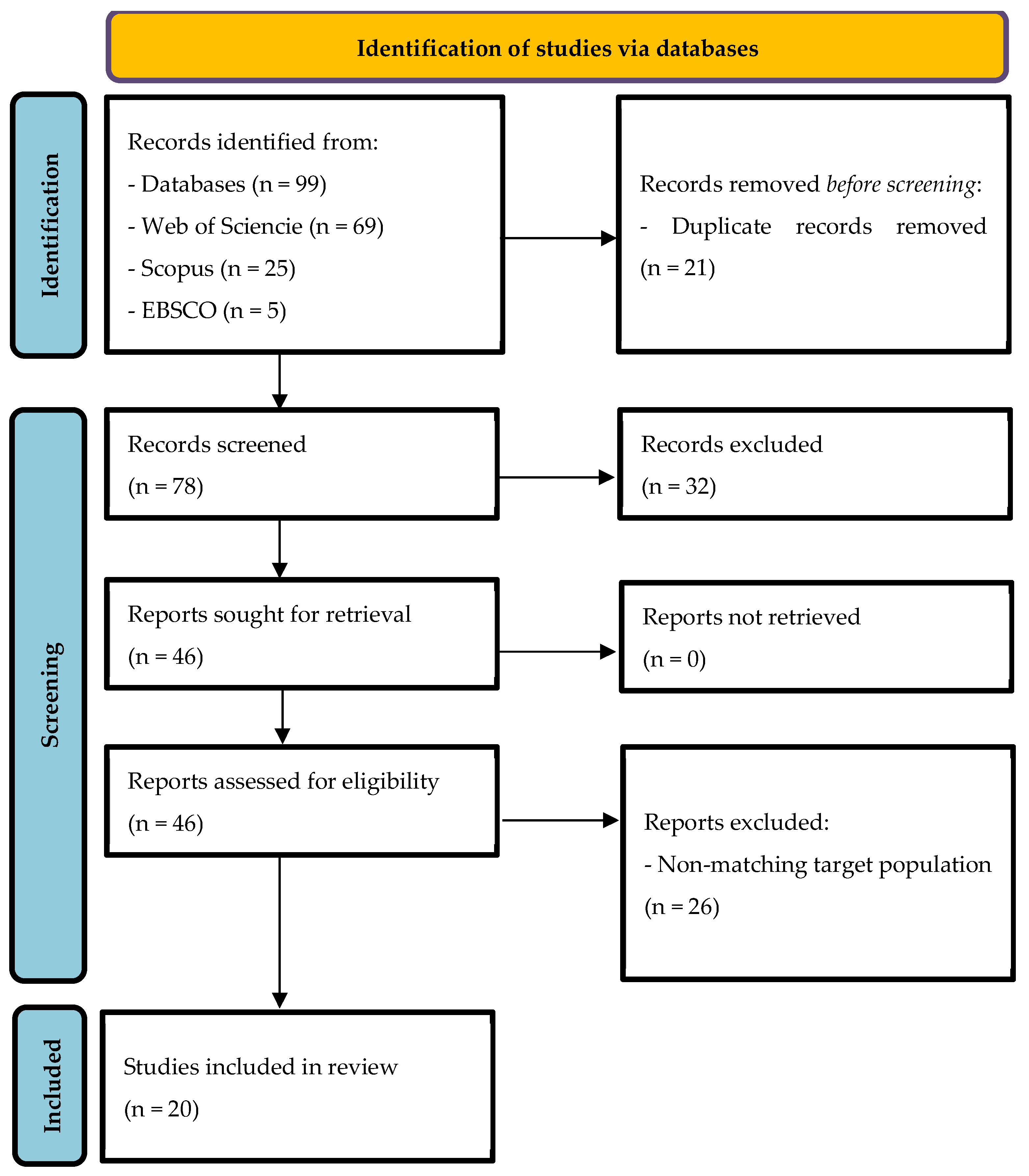 - Moola, S.; Munn, Z.; Tufanaru, C.; Aromataris, E.; Sears, K.; Sfetcu, R.; Currie, M.; Qureshi, R.; Mattis, P.; Lisy, K.; et al. Chapter 7: Systematic reviews of etiology and risk. In JBI Manual for Evidence Synthesis; Aromataris, E., Munn, Z., Eds.; JBI: Adelaide, SA, Australia, 2020; Available online: https://synthesismanual.jbi.global (accessed on 20 January 2025).