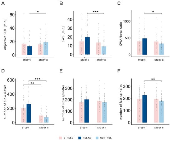 (A) Objective sleep onset latency: sleep onset latency was significantly longer in the neutral control condition of Study I compared with the relaxation condition of Study II (t61.27 = −2.43, p = 0.018, d = 0.608). This difference was not found when comparing both stress conditions (p = 0.746). (B) Time spent in slow-wave sleep (SWS) in minutes: Comparing the two control conditions, participants of Study I spent more time in SWS in the relaxation condition compared with participants of Study II in the neutral control condition (t55.12 = 3.38, p = 0.001, d = 0.833). This difference was not observed when comparing both stress conditions (p = 0.727). (C) Ratio between slow wave activity (SWA) and beta activity during NREM sleep, in the frontal area: The relaxation condition of Study I led to a significantly higher SWA/beta power ratio compared with the neutral control condition of Study II (t53.31 = 2.21, p = 0.031, d = 0.554). No difference was found when comparing the stress conditions of both studies (p = 0.925). (D) Number of slow waves (SWs) in the frontal area: More SWs were observed in Study I compared with Study II. However, the difference was bigger between both control conditions (t43.04 = 6.32, p < 0.001, d = 1.544), compared with the difference between both stress conditions (t51.73 = 3.34, p = 0.002, d = 0.823). A similar pattern was found for (E) the number of slow spindles in the frontal area; however, the differences between conditions across studies were not significant (both p-values > 0.185). (F) Number of fast spindles in the parietal area: The control conditions differed significantly, with more fast spindles observed in the relaxation condition of Study I compared with the neutral control condition of Study II (t53.88 = 2.79, p = 0.007, d = 0.688). However, the stress conditions did not differ across studies (p = 0.961). Means ± standard errors of the mean are displayed. ***: p ≤ 0.001; **: p ≤ 0.01; *: p ≤ 0.05.