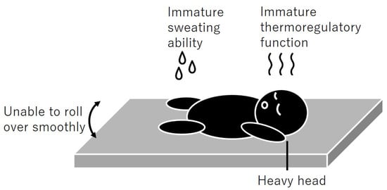 Although most existing studies focus on adults, emerging research indicates that heat emitted from the infant body can accumulate in bedding, raising both skin and core temperatures and potentially disrupting sleep–wake rhythms. Bedding materials with low breathability or excessive insulation may induce discomfort and arousal responses due to elevated body temperature. Baddock et al. [17] reported that infants who shared a bed exhibited higher skin temperatures—particularly in the lower limbs—and a tendency toward elevated core temperatures compared to those sleeping in cots. Franco et al. [18] found that increased ambient temperature raised the auditory arousal threshold in infants, suggesting that warmer environments may reduce the likelihood of waking, supporting the hypothesis that heat retention in bedding affects arousal mechanisms.